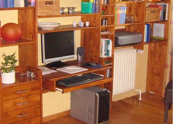 Bild 5 - "Kirsche" gebeizt, mit Schubladenschrank, PC-Bord mit Ausziehplatte (Tiefe 36 cm) und unter anderem Regale (Tiefe 30 cm), mit Breite auf Maß über- und nebeneinander.